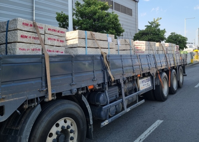 현무암담장석 6단 5톤축차로 8파래트 싣고 현장으로 출발
