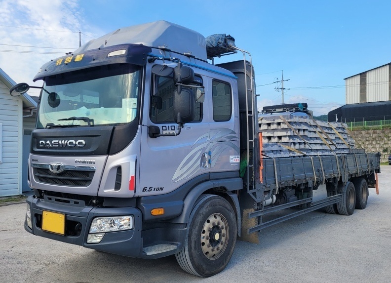 현무암자연괴석4파래트, 잔디2파래트 혼합으로 5톤 윙화물차에 상차사진입니다.