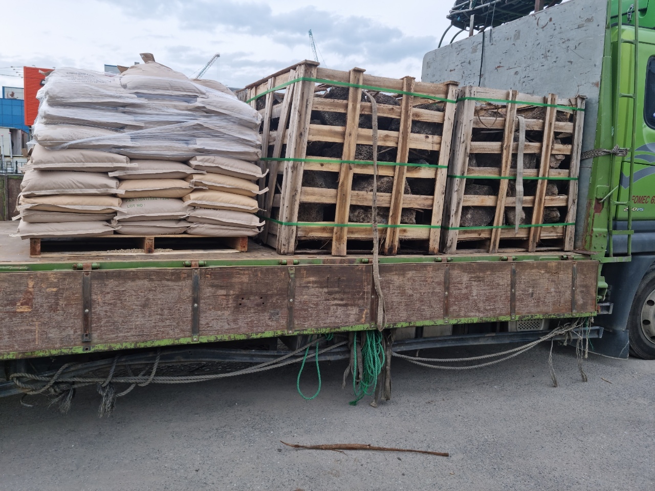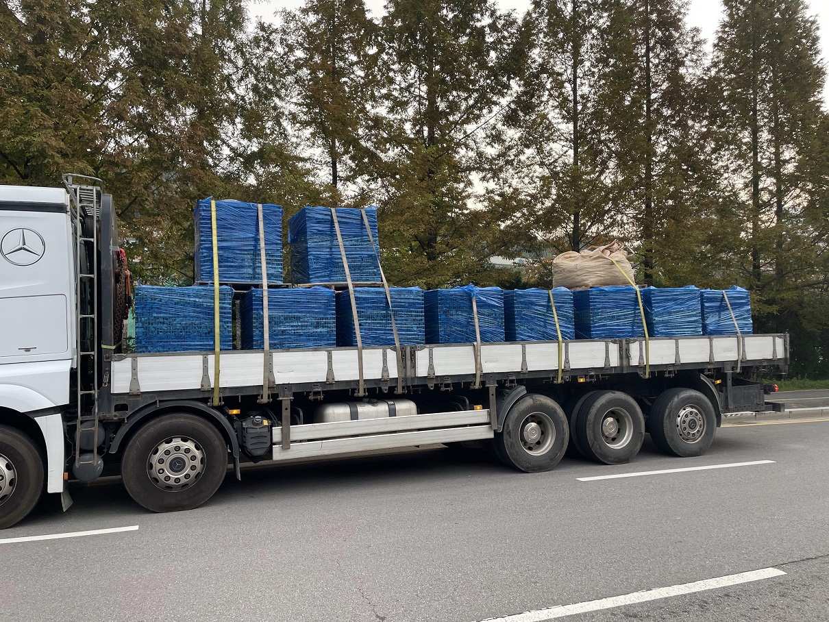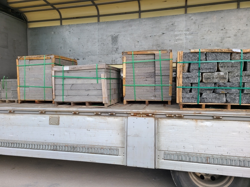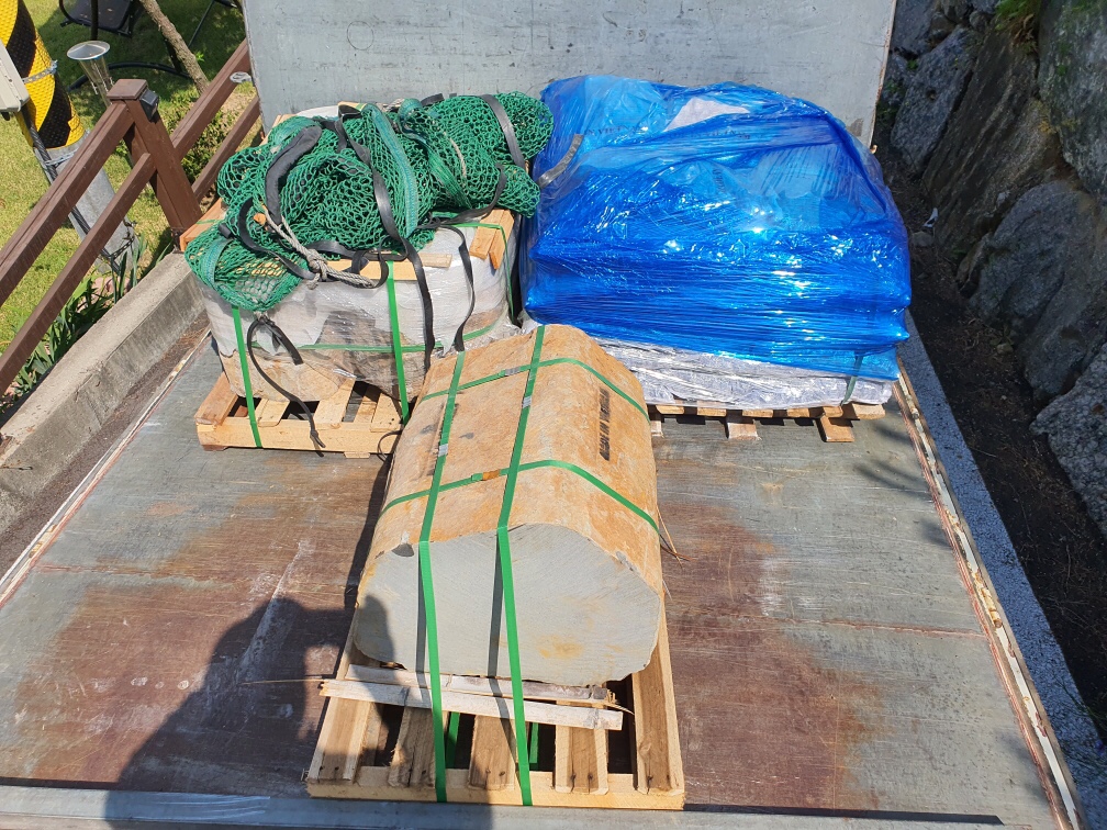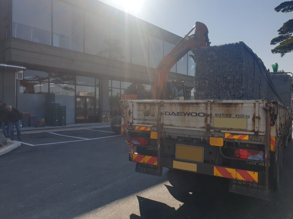 현무암자연괴석4파래트, 잔디2파래트 혼합으로 5톤 윙화물차에 상차사진입니다.
